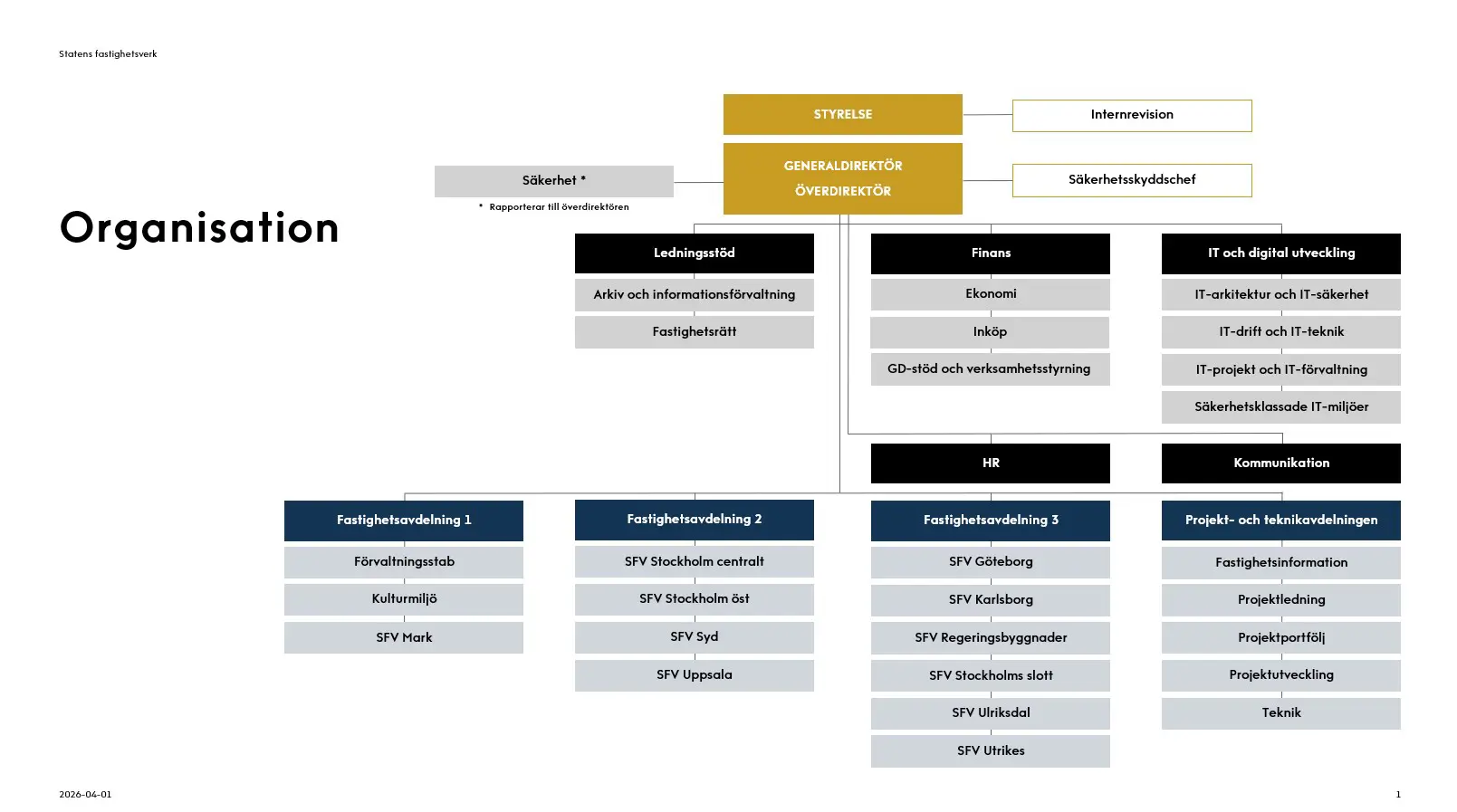 Statens fastighetsverks organisationsschema beskriver hur generaldirektör, överdirektör, styrelse, internrevisor, stödfunktioner, staber, avdelningar och fastighetsområden är placerade i organisationen.