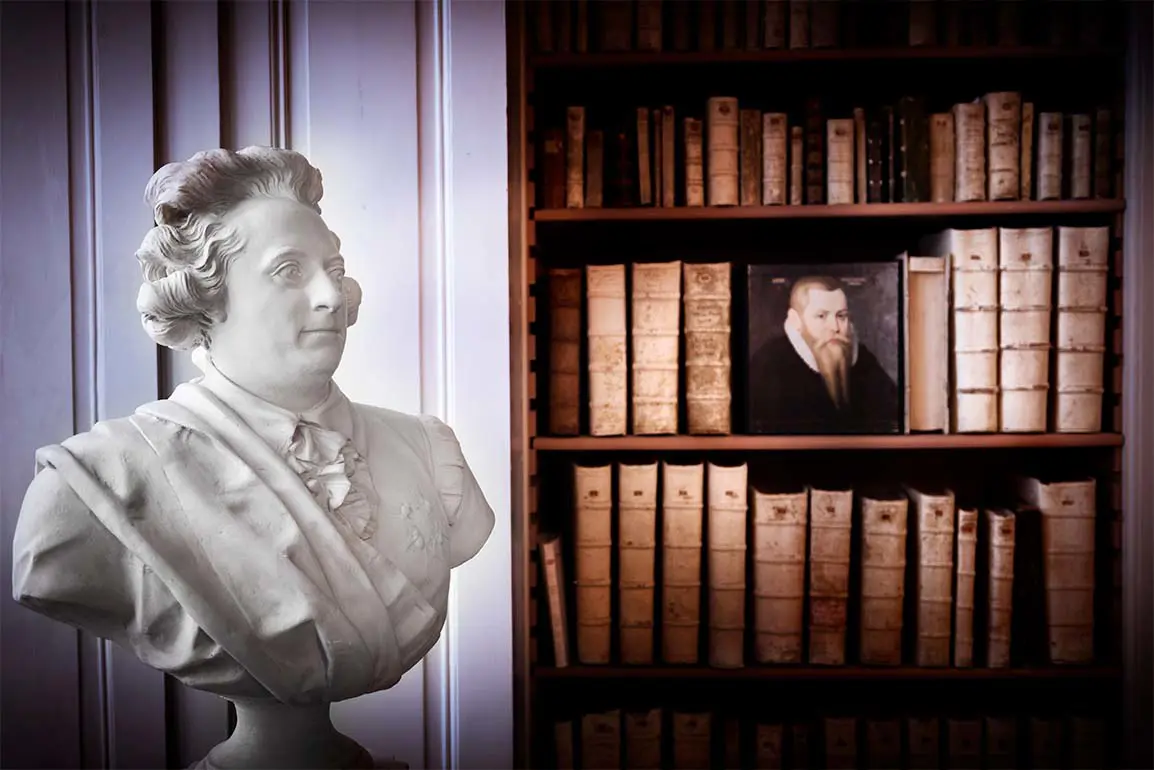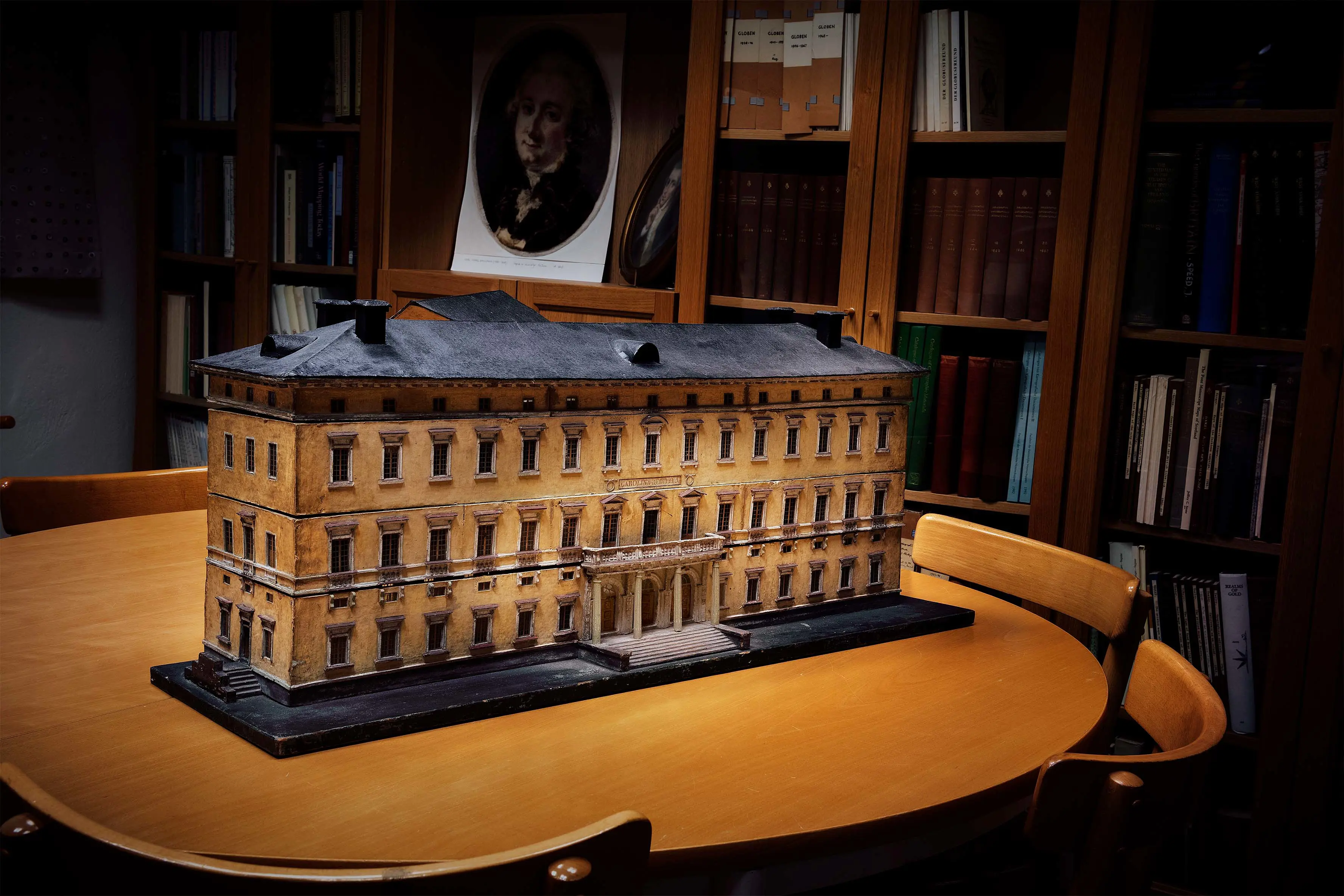 Gustav III testamenterade sitt privata arkiv till biblioteket. Porträttet i hyllan föreställer Hoegenskild Bielke vars boksamling finns här. Foto: Urban Jörén