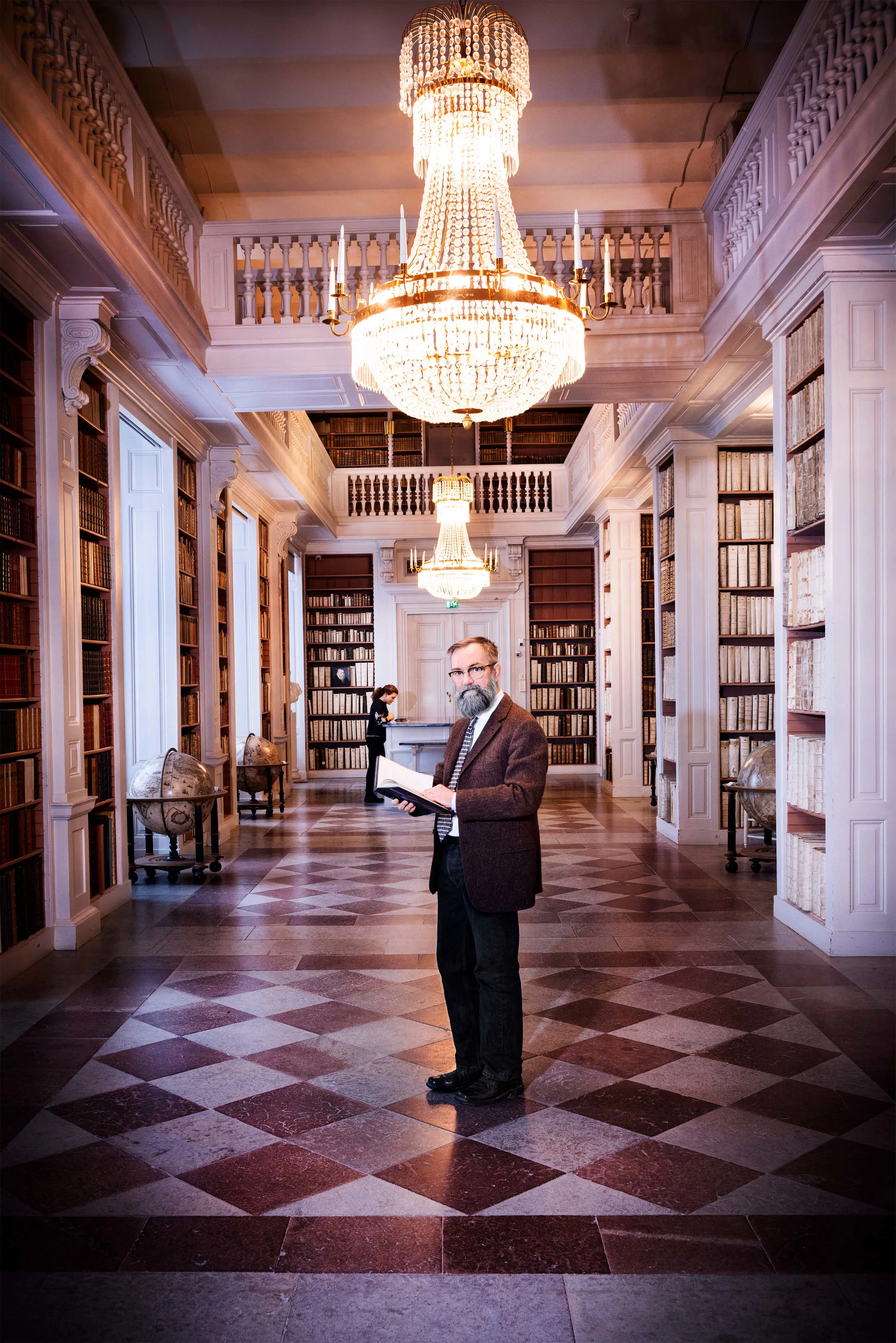 Överbibliotekarie Lars Burman i den stora boksalen, där endast personalen får röra dyrgriparna, till exempel drottning Kristinas böcker. Foto: Urban Jörén