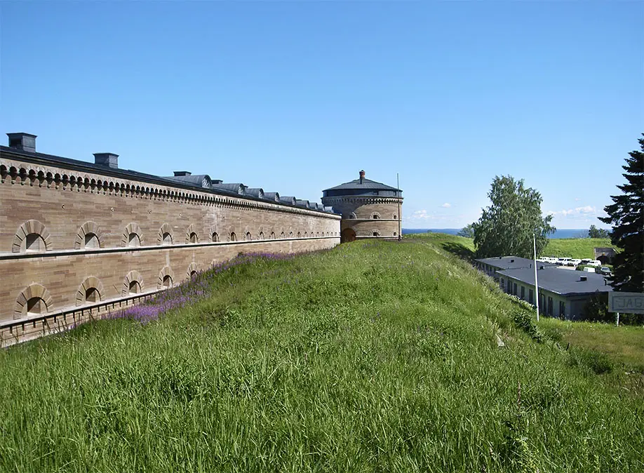 Vi ställer oss uppe på en av vallarna och tar oss en sista titt över området. Fotografen försöker fånga ytterligare någon vinkel innan vi rullar ut igen genom Götiska valvet, förbi samhället Karlsborg som växte fram som en följd av fästningen.