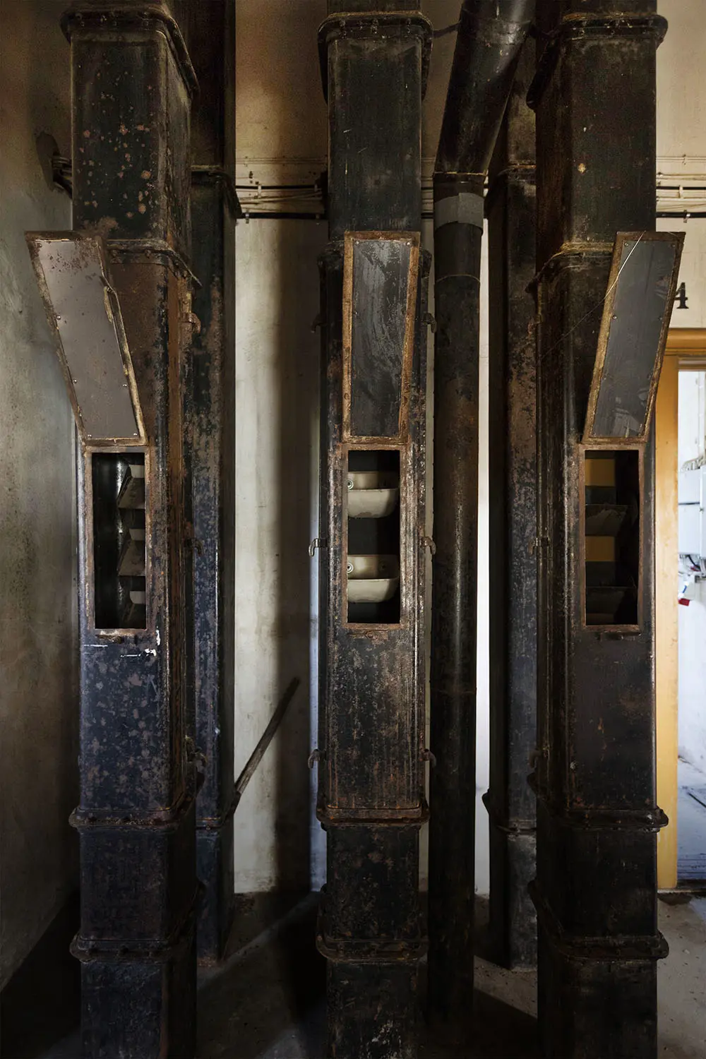 Men det är ingen enkel förrådsanläggning. Hela systemet är komplext uppbyggt där havren transporterades upp och ner mellan olika bingar genom ett fyndigt maskineri, bestående av roterande skovlar. Det viktiga var att inte havren blev varm eller för fuktig, för då kunde den förstöras.
