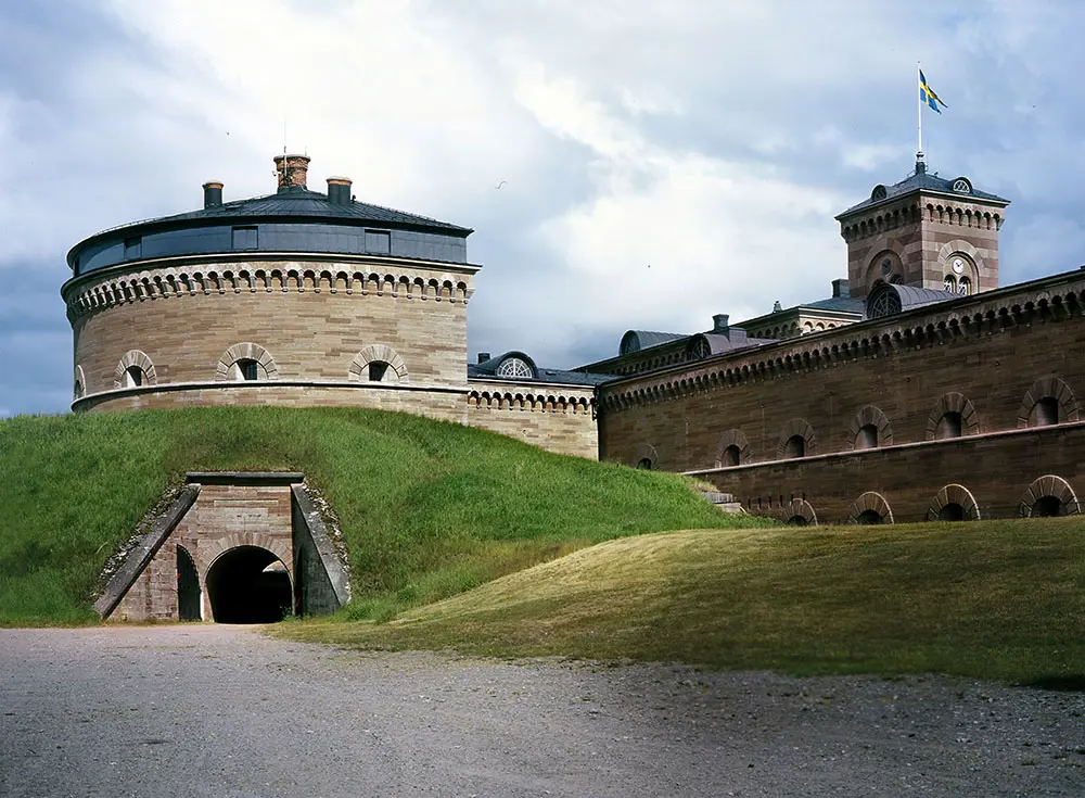 Vi åker genom entréporten, Götiska valvet, med Karl XIV Johans signatur – kungen som beslutade att bygga fästningen för att skapa en fast bas för försvaret liksom en säker plats för kung, regering, riksdag och Riksbankens guld i händelse av krig.