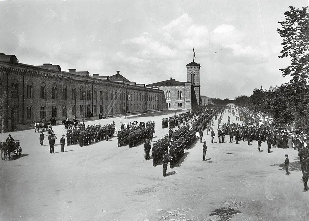 Oscar II hälsar på trupperna vid Karlsborgs fästning 1898. Foto: Armémuseum