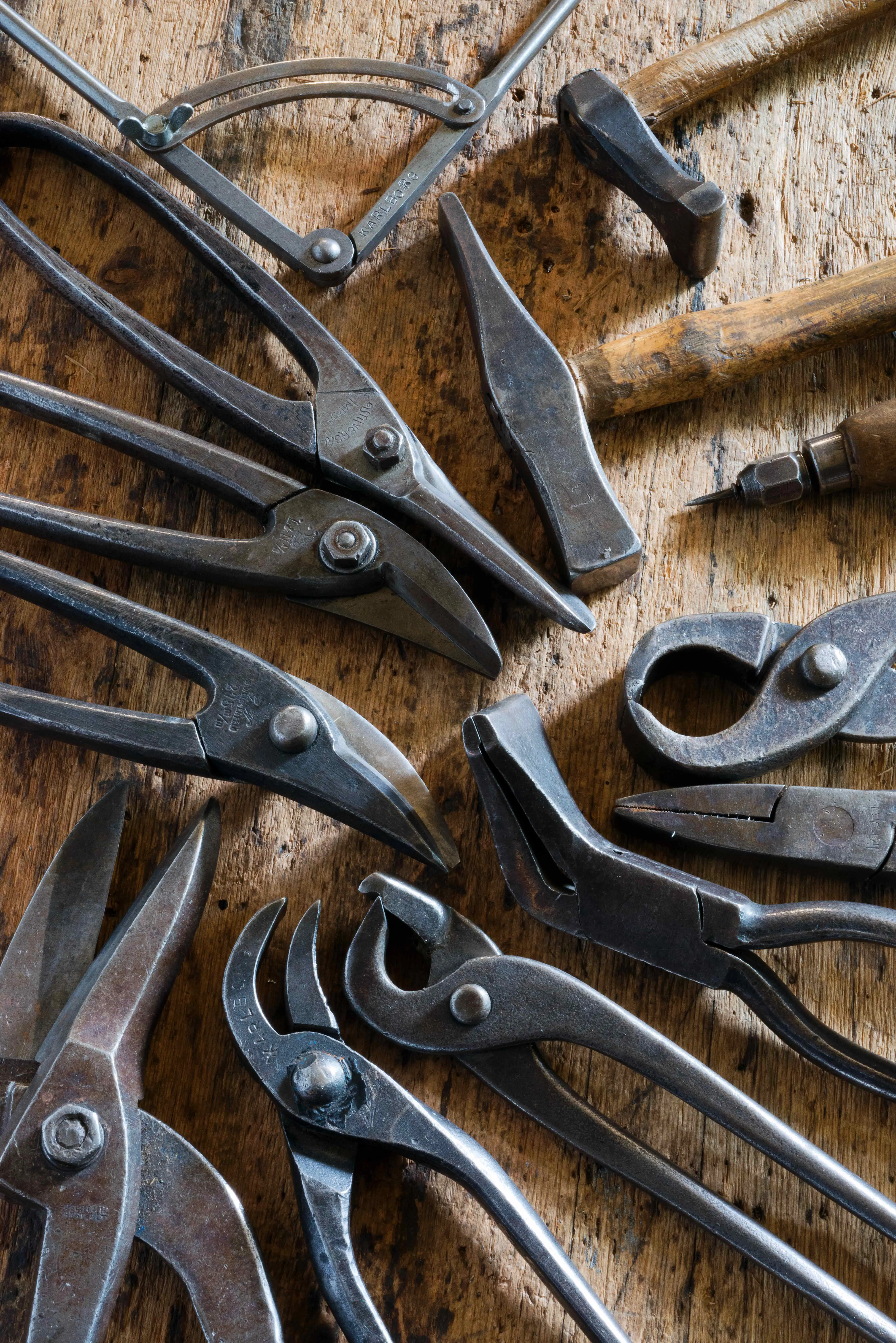 För plåtslagaren krävs flera olika typer av saxar, tänger, hammare och klubbor för att kunna driva och sammanfoga plåt. Foto: Dick Norberg