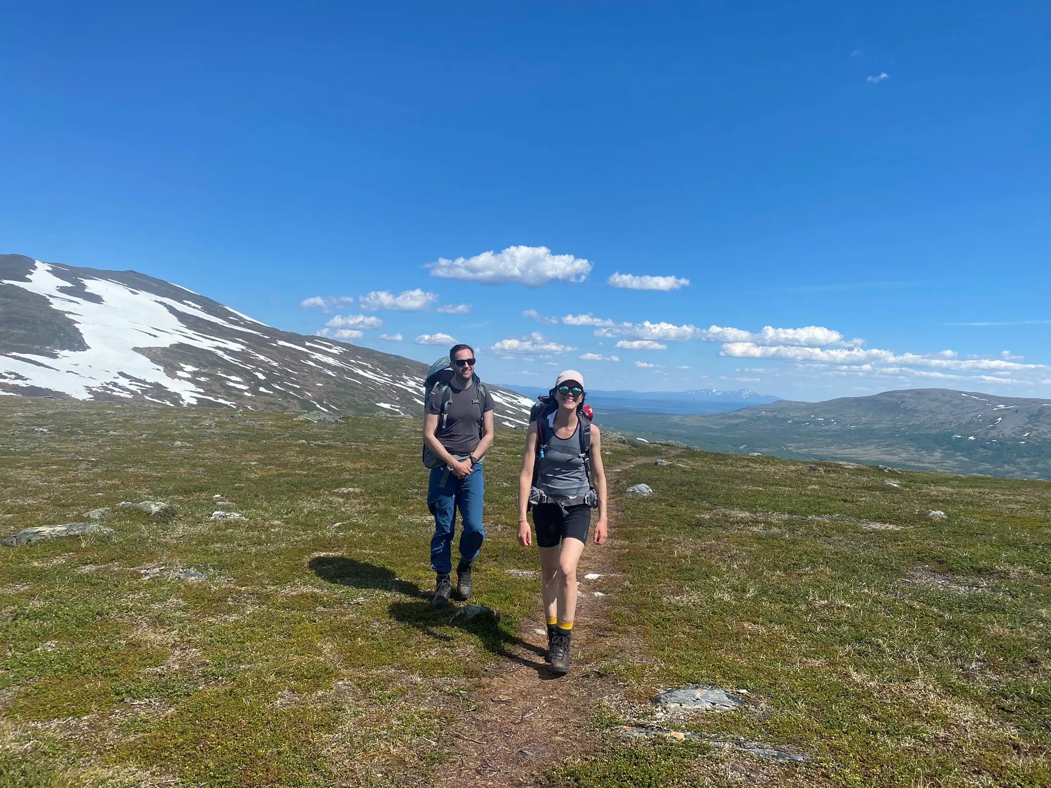 De fyra mest vältränade fortsätter hela vägen upp, men Erik och jag vänder på Vierranvárri, som ligger 1 700 meter över havet. Om vi skulle ha fortsatt är det 200 meter ner i Kaffedalen och sedan uppåt igen till Sydtoppen. Jag är motvillig, men min kloke man påminner mig om att vi gått 6 timmar och ska ner igen. Tack vare midnattssolen kan man ju vandra dygnet runt här.