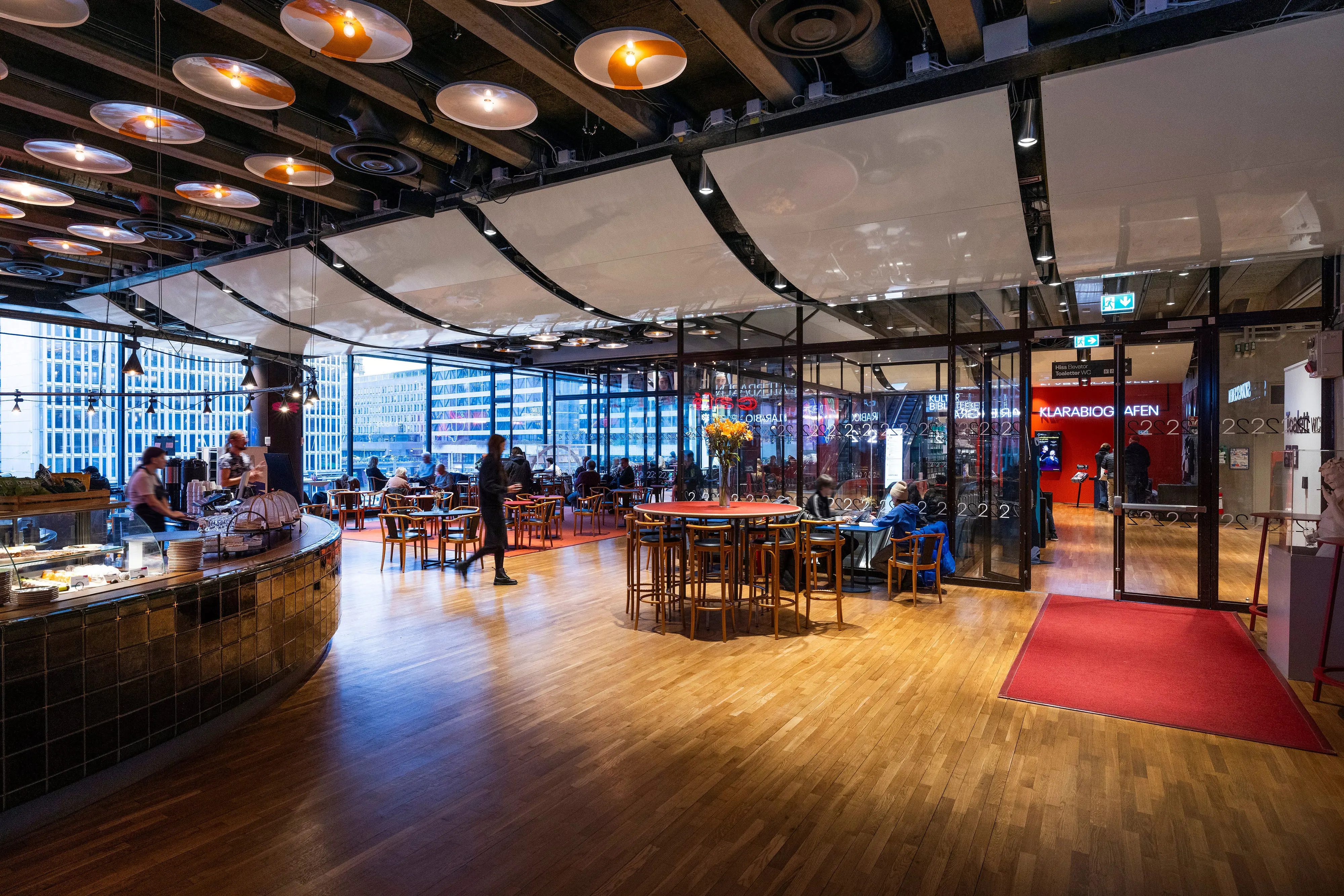 Café, bibliotek, teater och biograf. Kulturhuset är en levande och dynamisk miljö. I taket har ursprungliga armaturer hängts upp med nya ljuskällor. Foto: Melker Dahlstrand