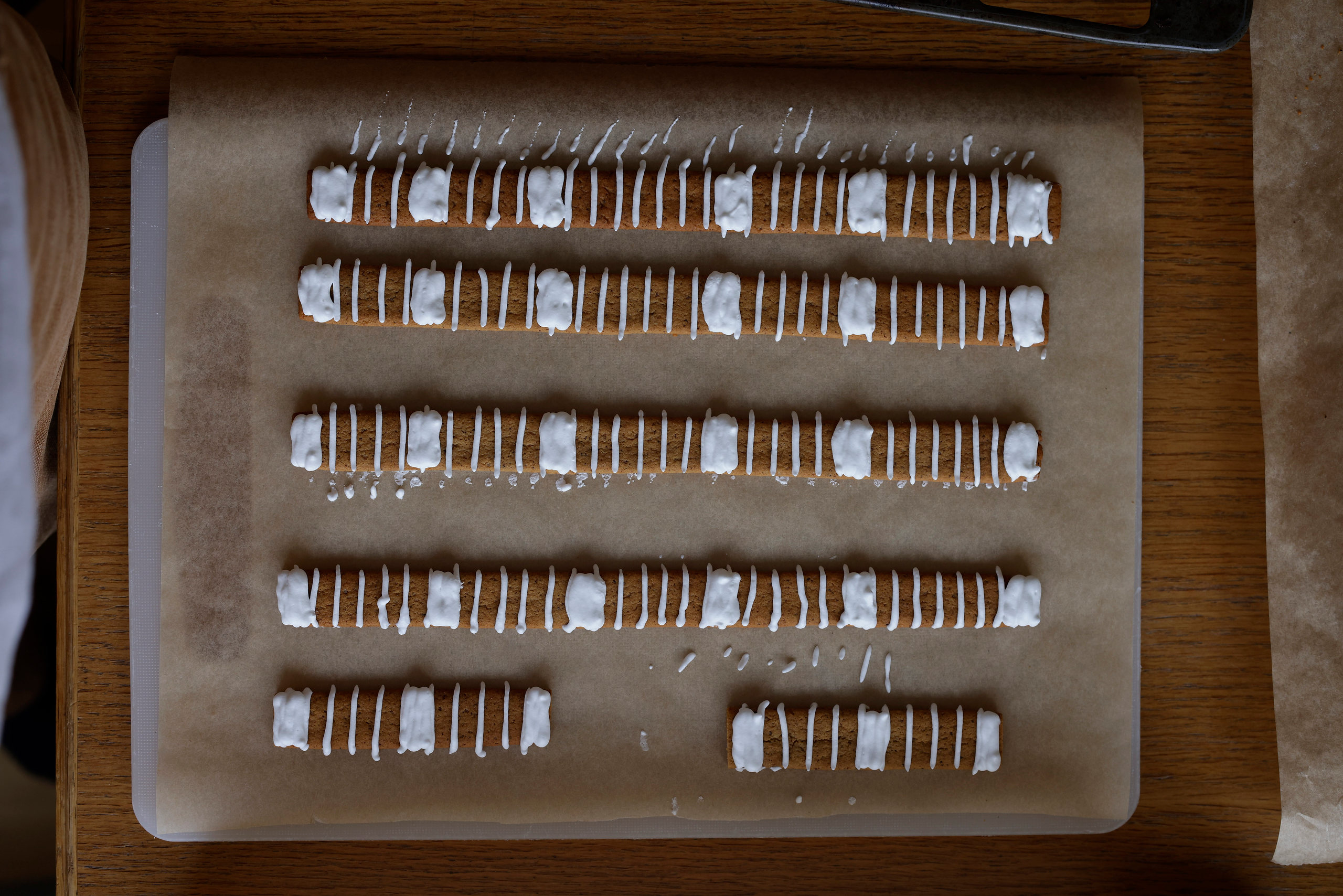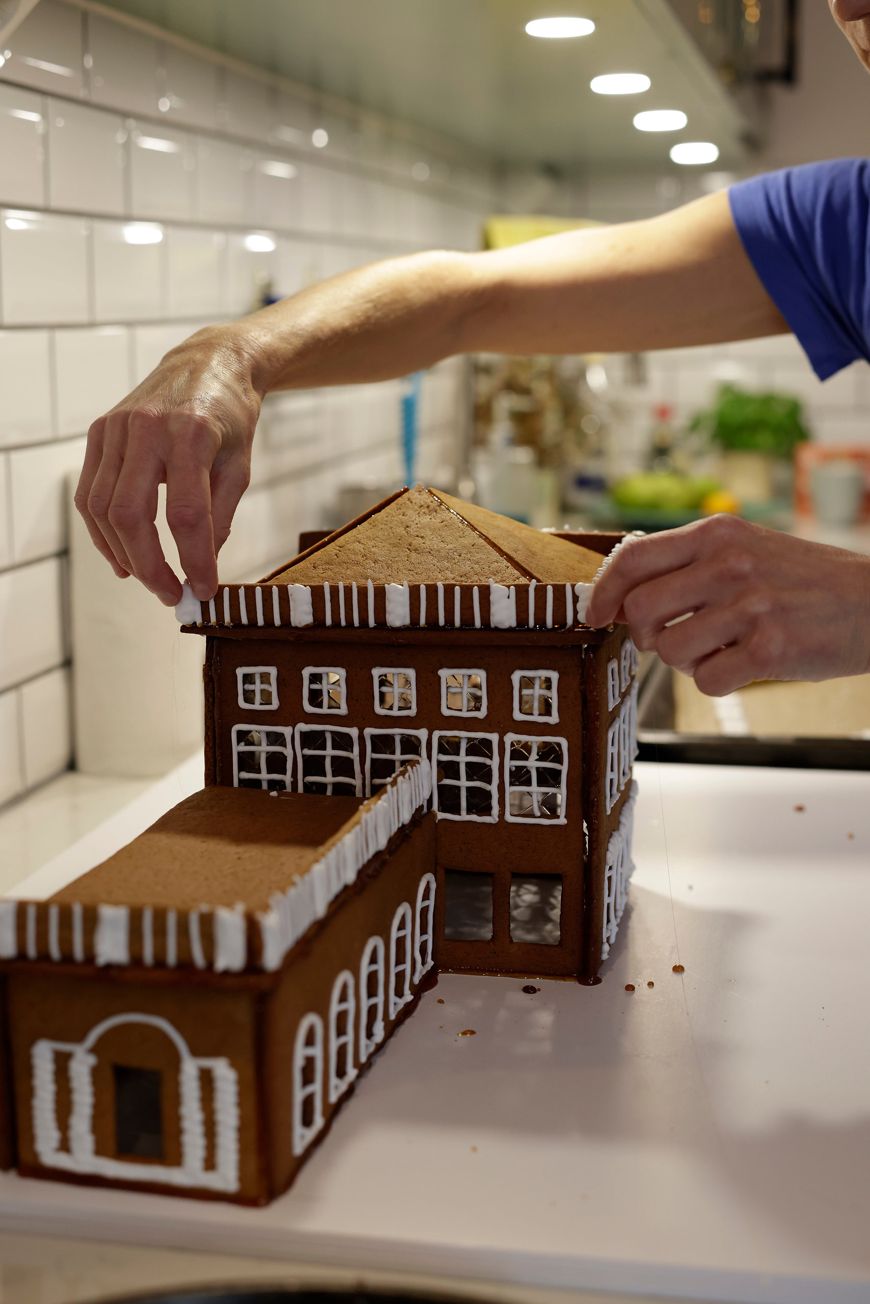Men åter till pepparkaksbaket. Mia Öhrn har skurit till och gräddat varje byggnadsdel i förväg. Alla delar granskas noga och de som behöver justeras filas till med zestjärn. Fogmassan är smält socker, som bubblar segt i en stekpanna av gjutjärn. Som stöd vid monteringen, och för att huset ska kunna flyttas, använder hon en tjock pappskiva som grund.