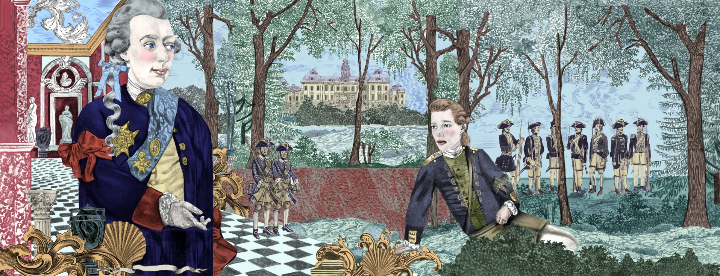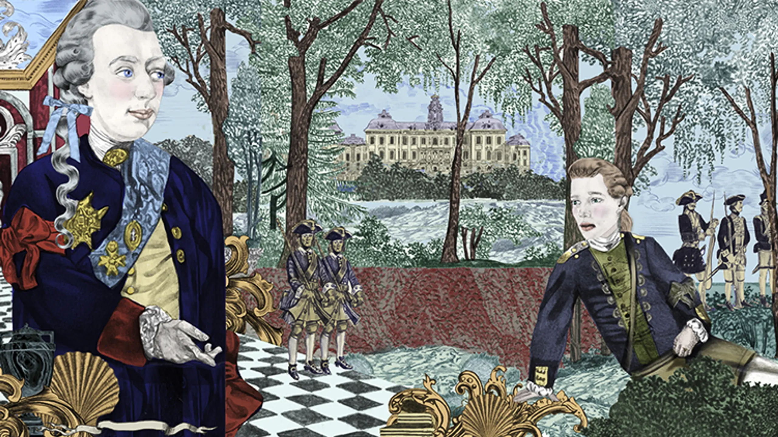 annat är att skydda konungen. Männen i sina blågula uniformer, stövlar och värja står raka i ryggen i givakt då kung Gustav III passerar. Plötsligt faller en av gardessoldaterna ned på marken framför kungens fötter.