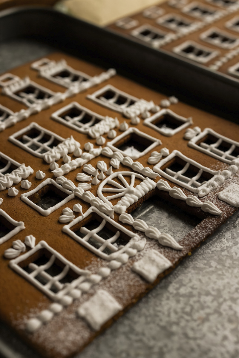 1. Kavla ut degen på lätt mjölat underlag. Flytta sen den utkavlade degen till en plåt med bakplåtspapper. Skär ut pepparkakshuset efter ritningarna direkt på plåten, så slipper du flytta delarna efteråt.