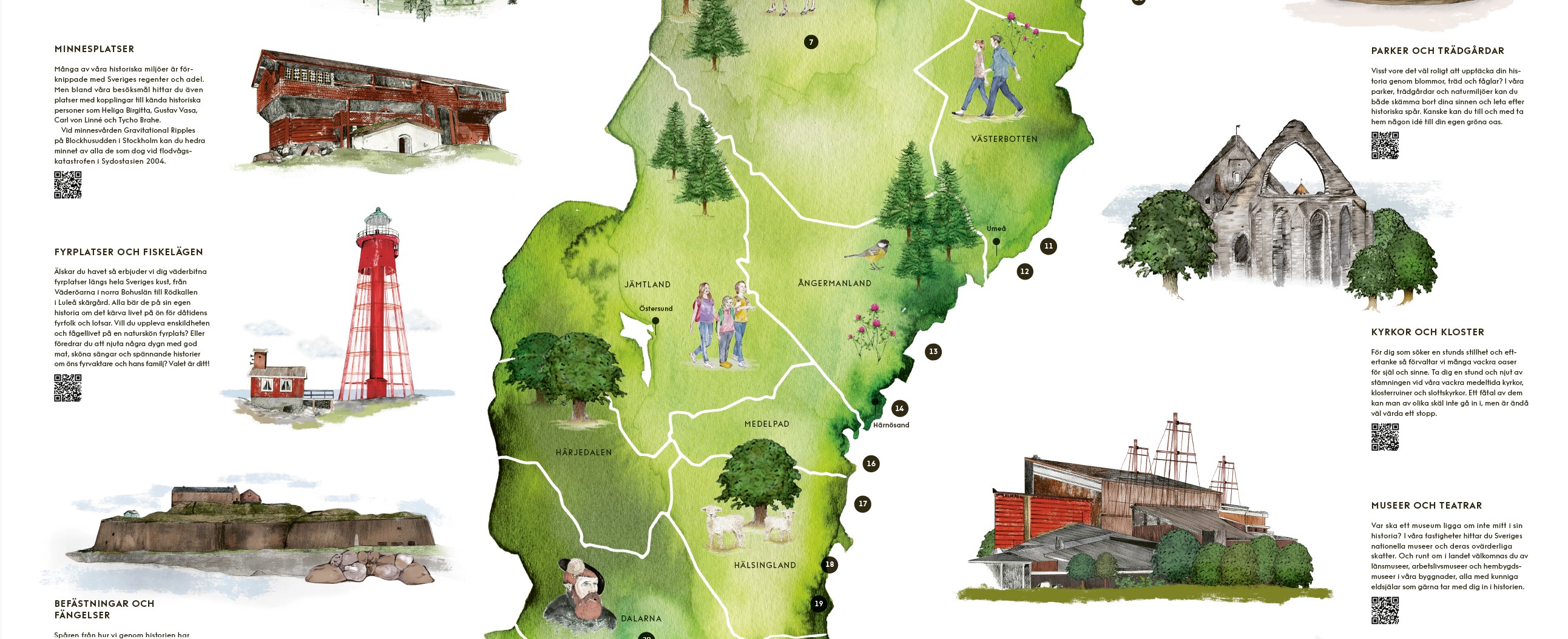 På den här kartan har vi samlat 206 kända och okända historiska besöksmål runtom i Sverige. Varje plats döljer oräkneliga historier. Dramatiska, eländiga och romantiska berättelser eller bara underbart vardagliga scener. Hur människor har tänkt, levt, älskat och kämpat. Livsöden för evigt länkade till platserna.