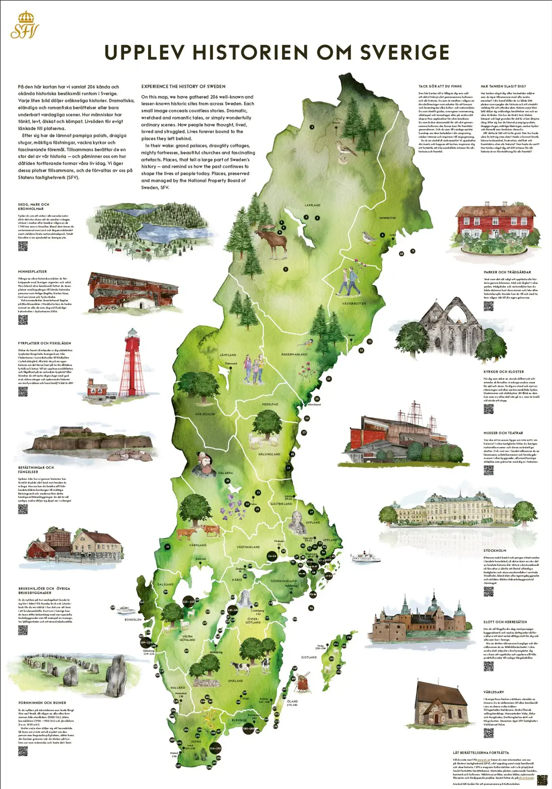 På den här kartan har vi samlat 206 kända och okända historiska besöksmål runtom i Sverige. Varje plats döljer oräkneliga historier. Dramatiska, eländiga och romantiska berättelser eller bara underbart vardagliga scener. Hur människor har tänkt, levt, älskat och kämpat. Livsöden för evigt länkade till platserna.