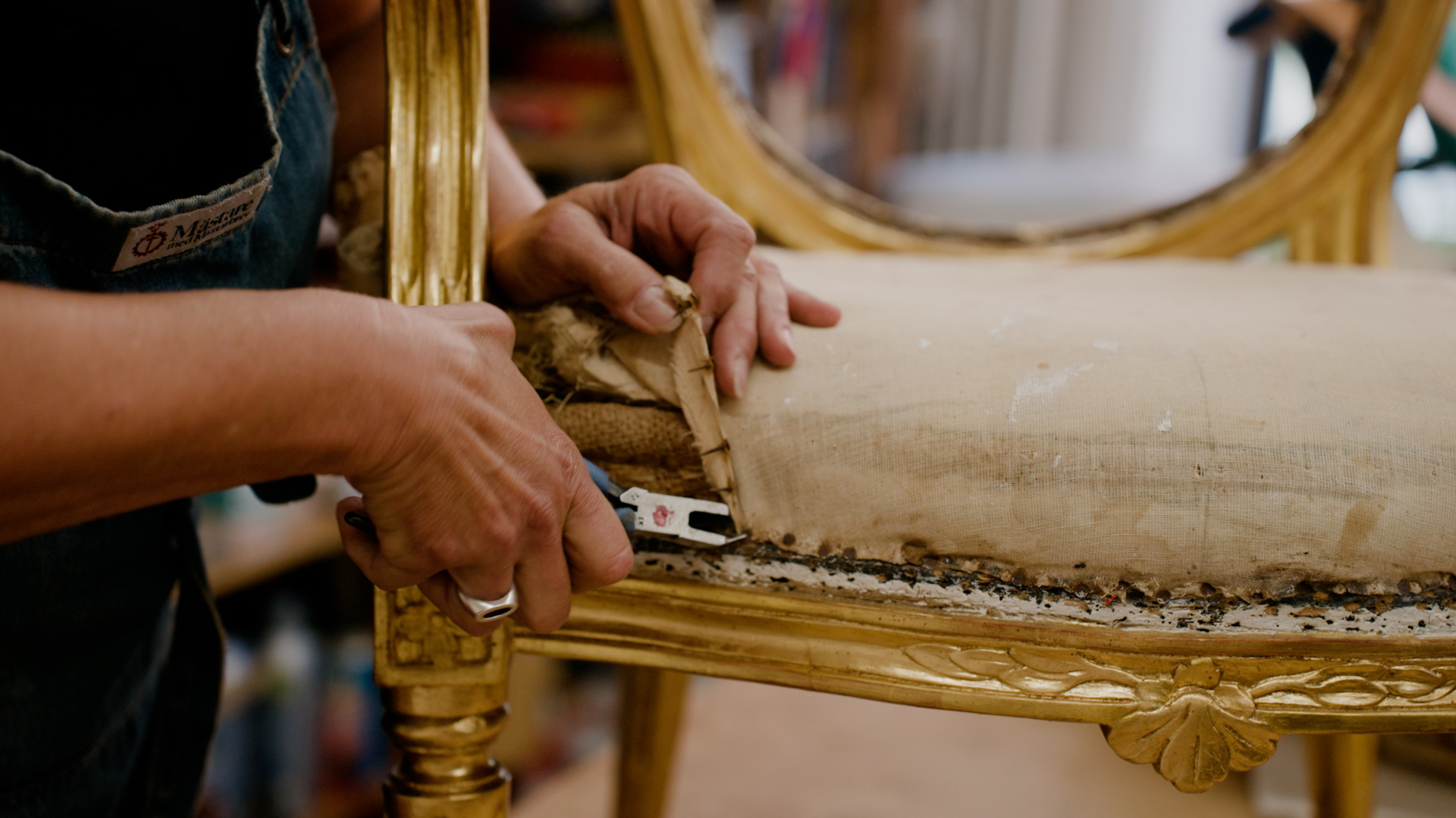 Blixten slog ned och Birgitta Welle blev kär i tapetseraryrket. Statens fastighetsverks uppdrag ger henne möjlighet att få jobba för hand med gamla material precis som för flera hundra år sedan - och antika och återbrukade möbler får fortsätta tjäna den allmänna under ett långt liv.