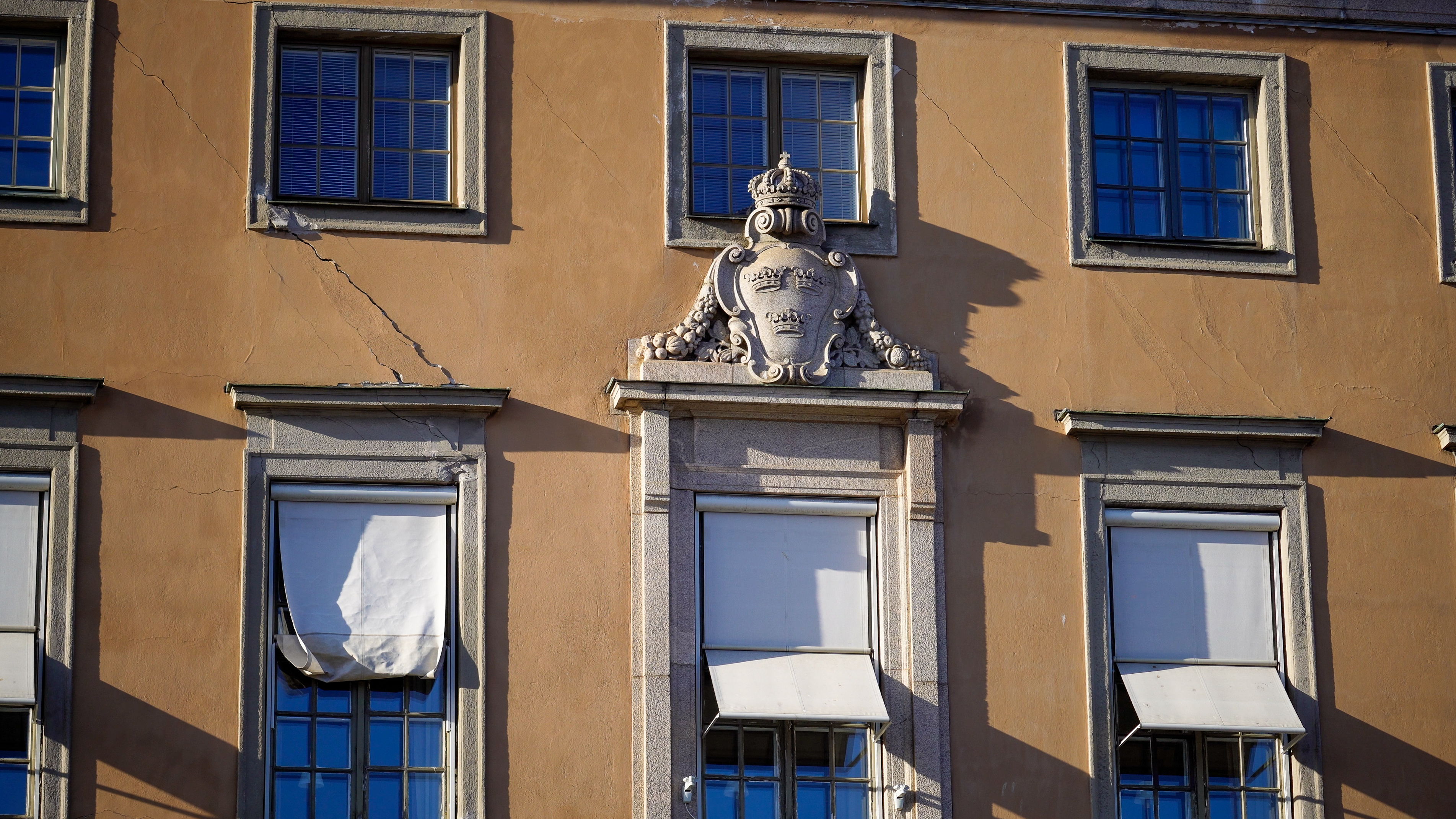 Sprickor i fasaden har uppstått efter den tidigare grundförstärkningen. Under 2029 beräknas huvudbyggnadens fasad vara färdigrenoverad.