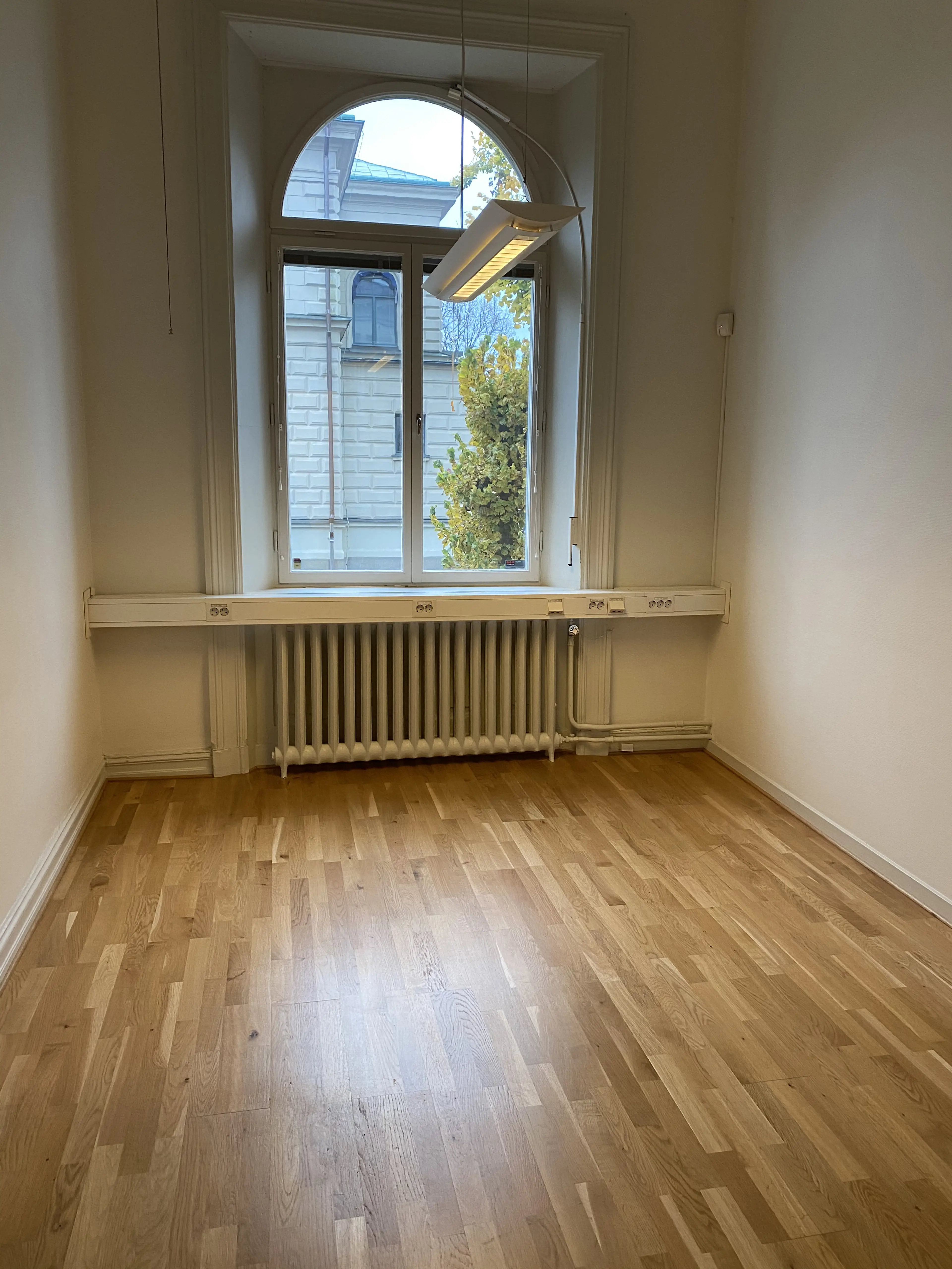 Den lediga lokalen är både representativ och mysig på samma gång. Äldre charm som spegeldörrar och fina fönsternischer är genomgående. På golvet ligger trägolv och väggarna är ljusa. Det finns totalt tre kontorsrum. Gemensamt utrymme för pentry och wc delas med en annan hyresgäst. Möjlighet finns att dela wifi m.m.