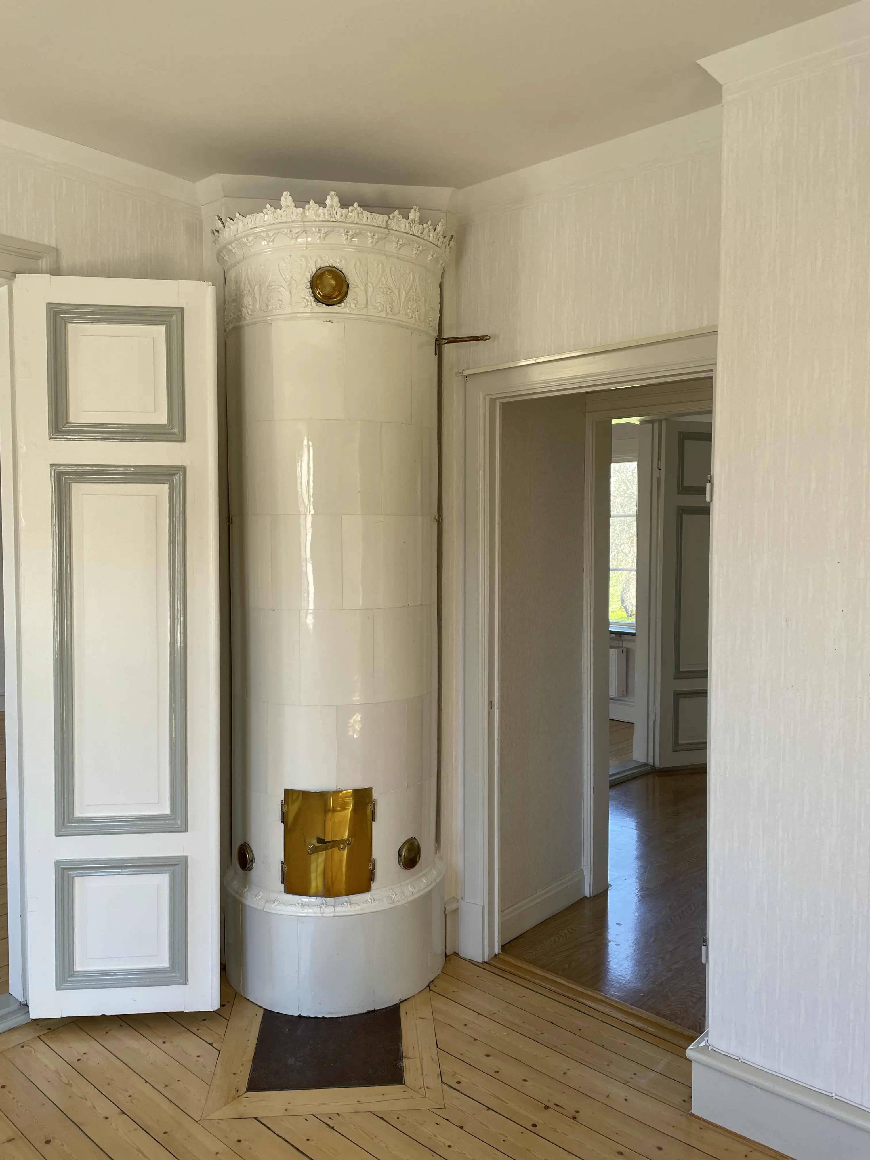 Kakelugn i lägenheten. OBS! Bild före renovering. Foto: Mikaela Windestål, SFV