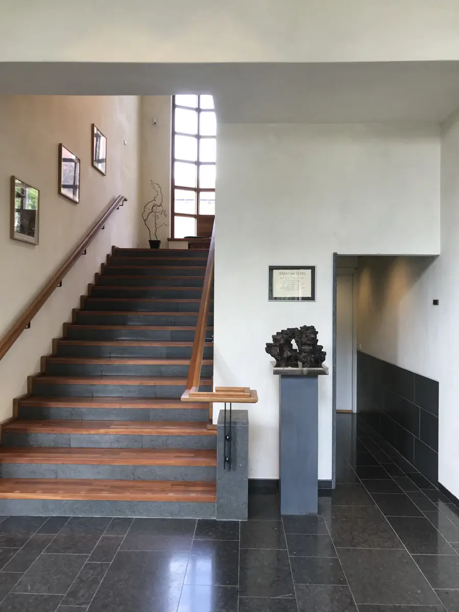 Medan den yttre tegelfasaden går i mörkare toner har det inre putsats i ljusare toner. Lokalerna varierar i form och storlek och de material som används är få och enhetliga.