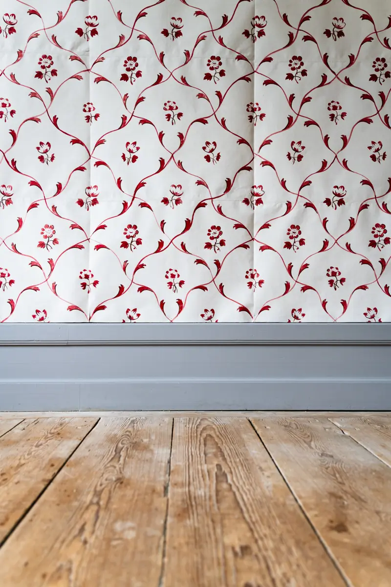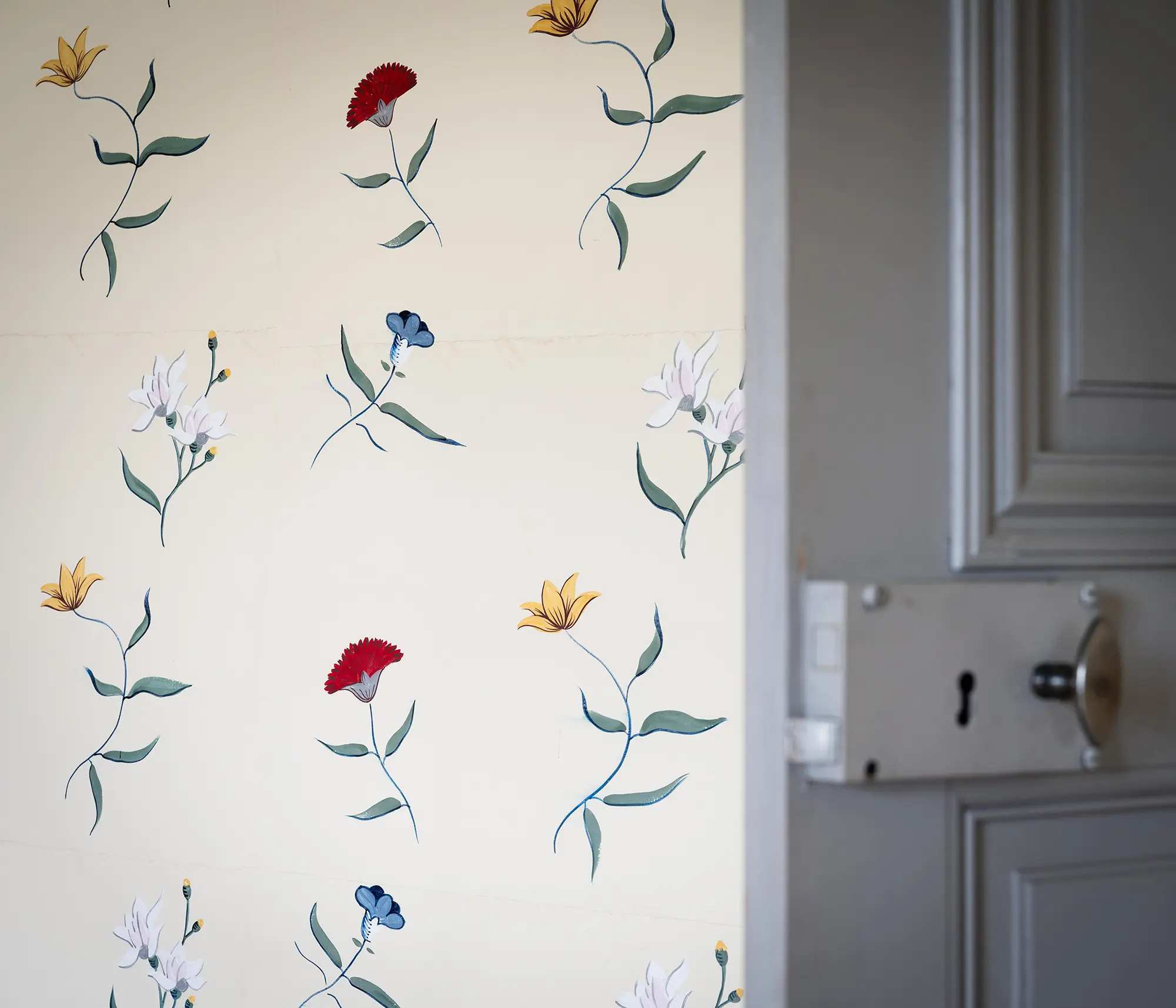 Till tapeterna användes handgjorda pappersark som är 63 x 53 cm. Arken limmades i våder och syddes ihop med lintråd. Därefter målades tapeterna för att sedan spikas upp på väggarna.